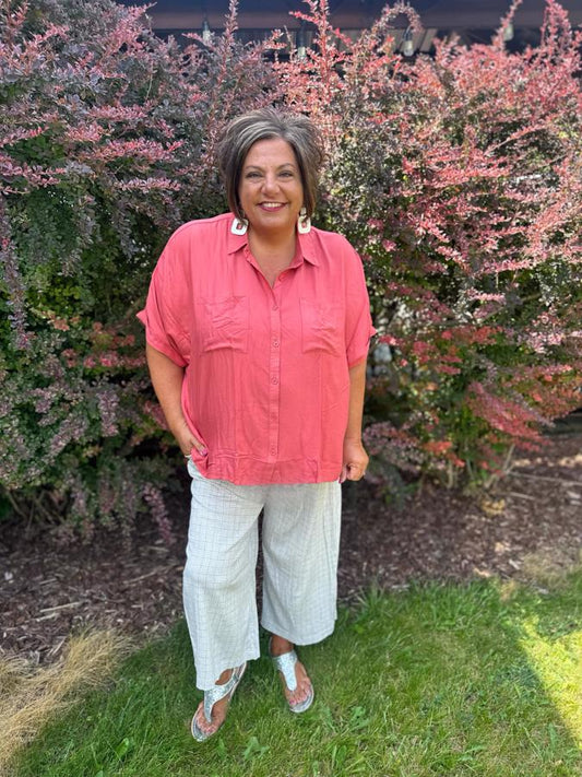 A versatile essential for any occasion, the Amy Button-Up Top is back! Featuring a sophisticated collar neckline and Dolman sleeves with folded tacked cuffs, this top effortlessly transitions from office chic to evening elegance.