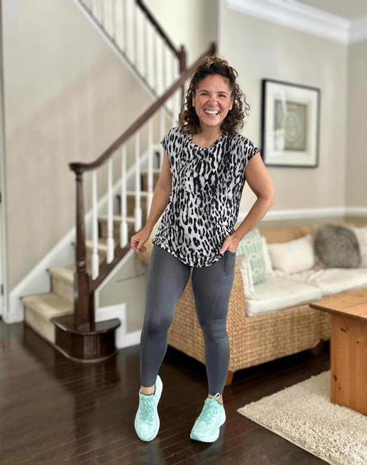 A high waist medium impact fitness tight 7/8 length legging that hits right above the ankle. Slimming stripes at the natural side seams. With an outside hip smartphone pocket and hidden interior waist key pocket.